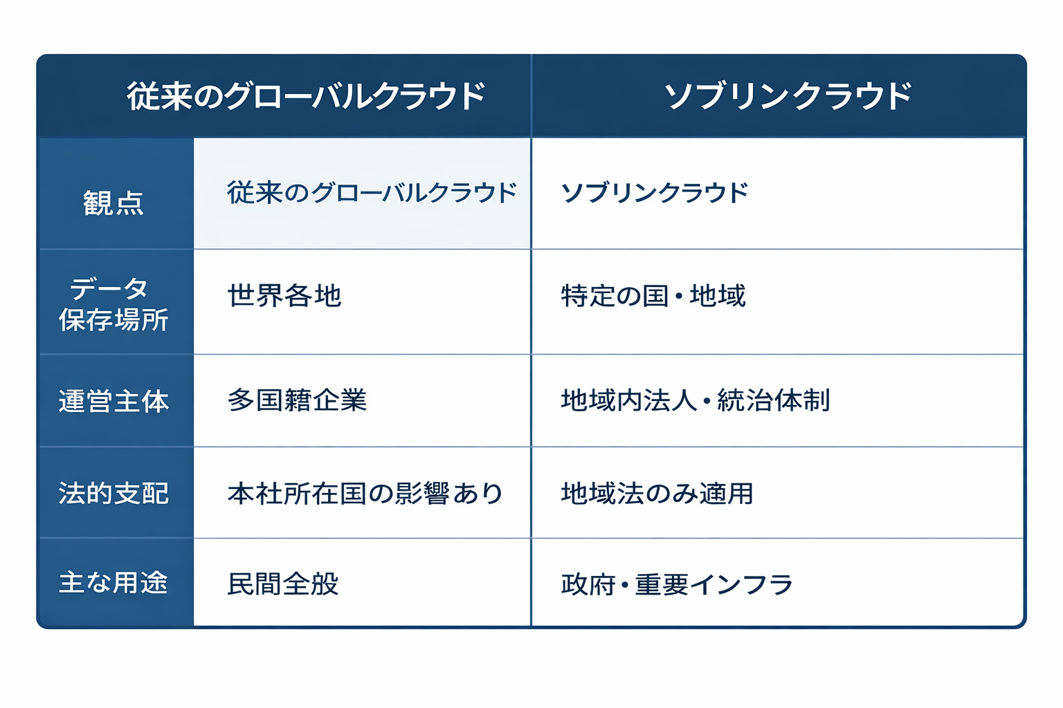 ソブリンクラウドと従来のグローバルクラウドの違いは、単なる「データの置き場所」だけではありません。運営の主体や法的な支配関係、想定される利用目的まで含めて設計思想が大きく異なります。